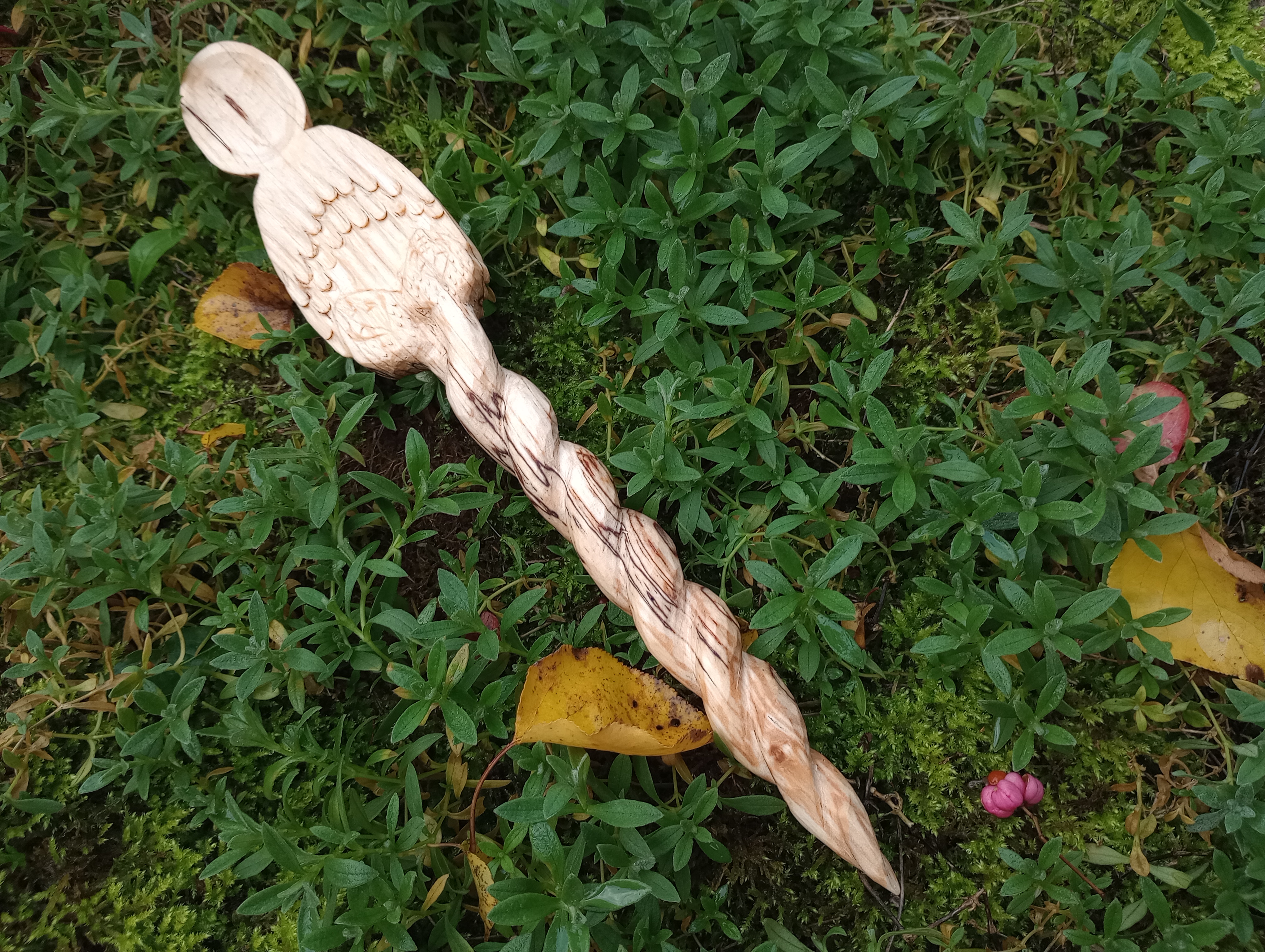 Zelf wilde ik bij het thema post blijven, dus had ik het in mijn hoofd gehaald een caduceus te maken, de staf van de Griekse god Hermes, boodschapper van de goden. Een cadudeus is een staf met vleugels en twee slangen eromheen. De vleugels ging ik reliëf snijden. Dat had ik nog nooit gedaan, maar ik dacht dat ik dat wel zou kunnen. Alsof dat nog niet genoeg was, viel mijn oog op een stuk berk met slaap om de lepel uit te halen. Niet echt ideaal snijhout, maar wel van die mooie kleuren…
