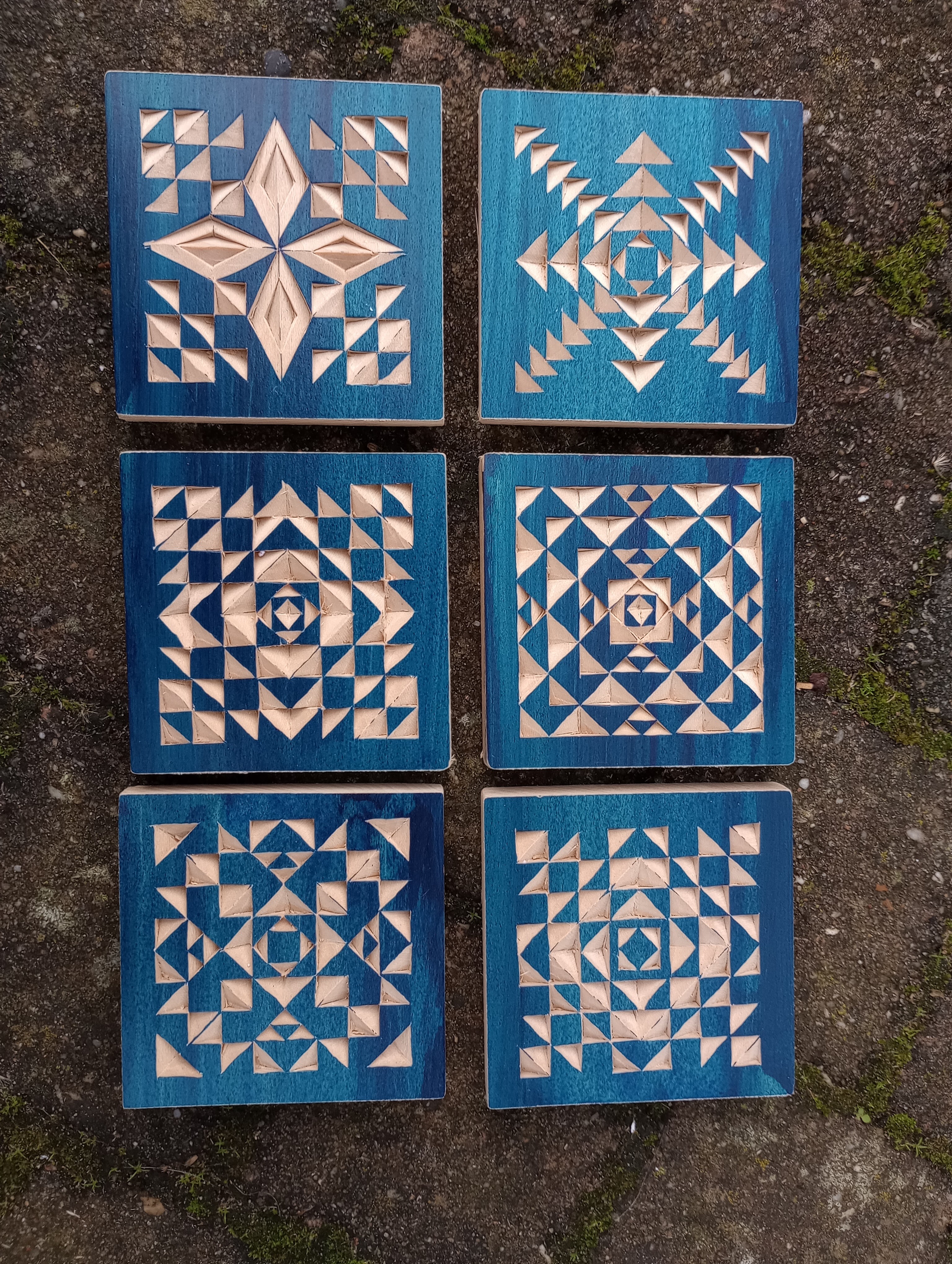 Deze keer heb ik het hout eerst geverfd. Ik vind het contrast van de kerfjes met het lichte hout dan altijd zo mooi uitkomen. Het bleek wel dat ik de ruggetjes tussen twee driehoekjes die tegen elkaar aan liggen, eigenlijk wat dieper moet wegsnijden dan ik zou willen. De verf trekt namelijk het hout in, waardoor ik een blauwe zweem bleef zien als ik het netjes sneed. Terwijl ik al een laag lak onder de verf had zitten, juist om dit te voorkomen! Ik ga het volgende keer met een andere lak proberen…
