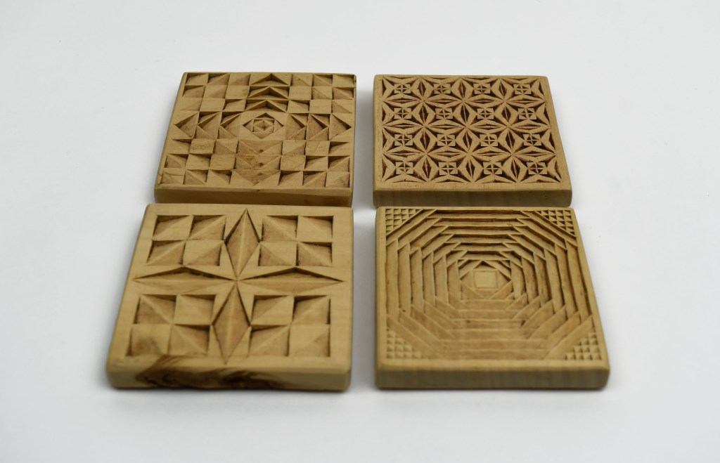 Koffietafel met patroon van vlakvullingen (II)Schorsplankje met ombré bloemmotievenOnderzetters geïnspireerd door quiltsKistje met traditioneel patroon
