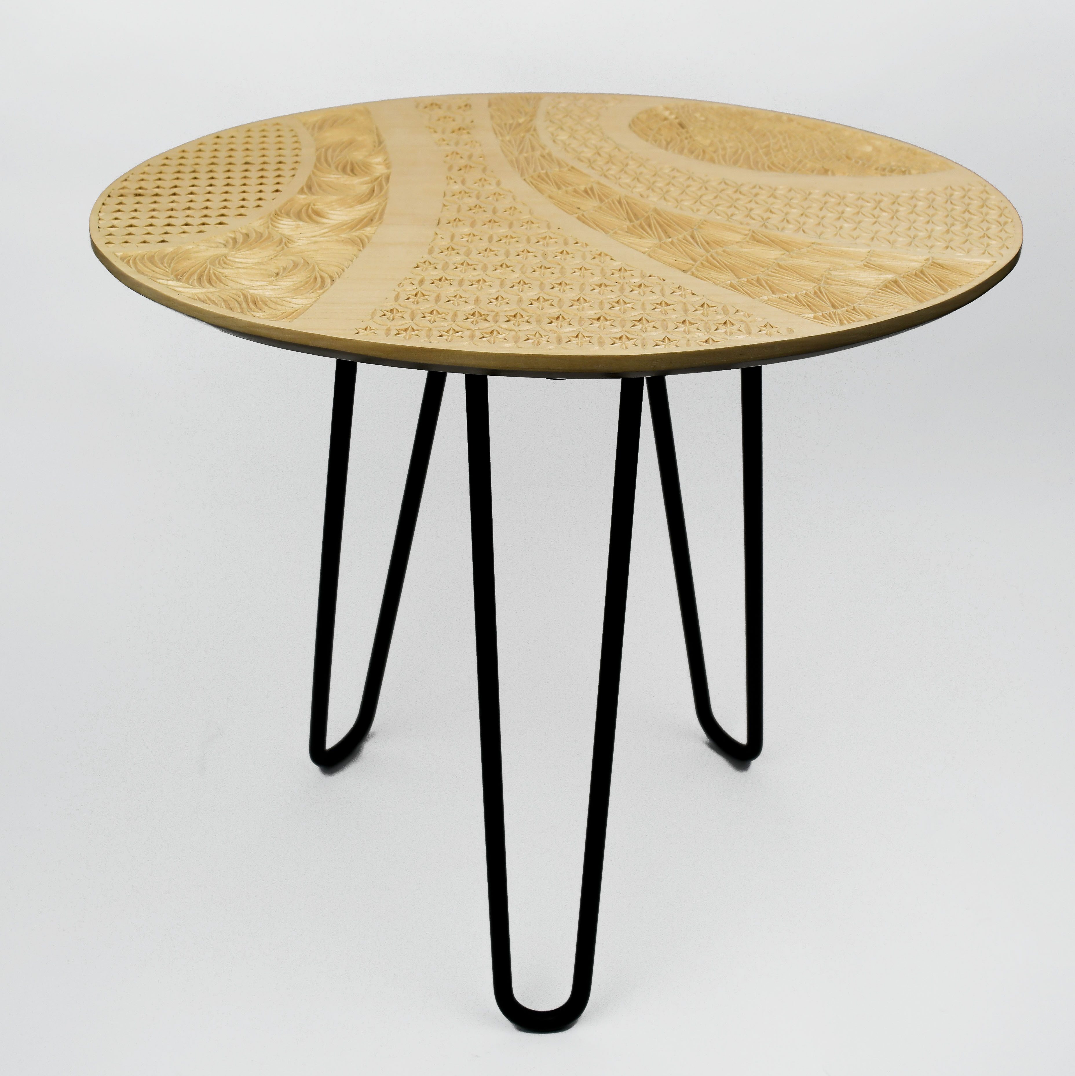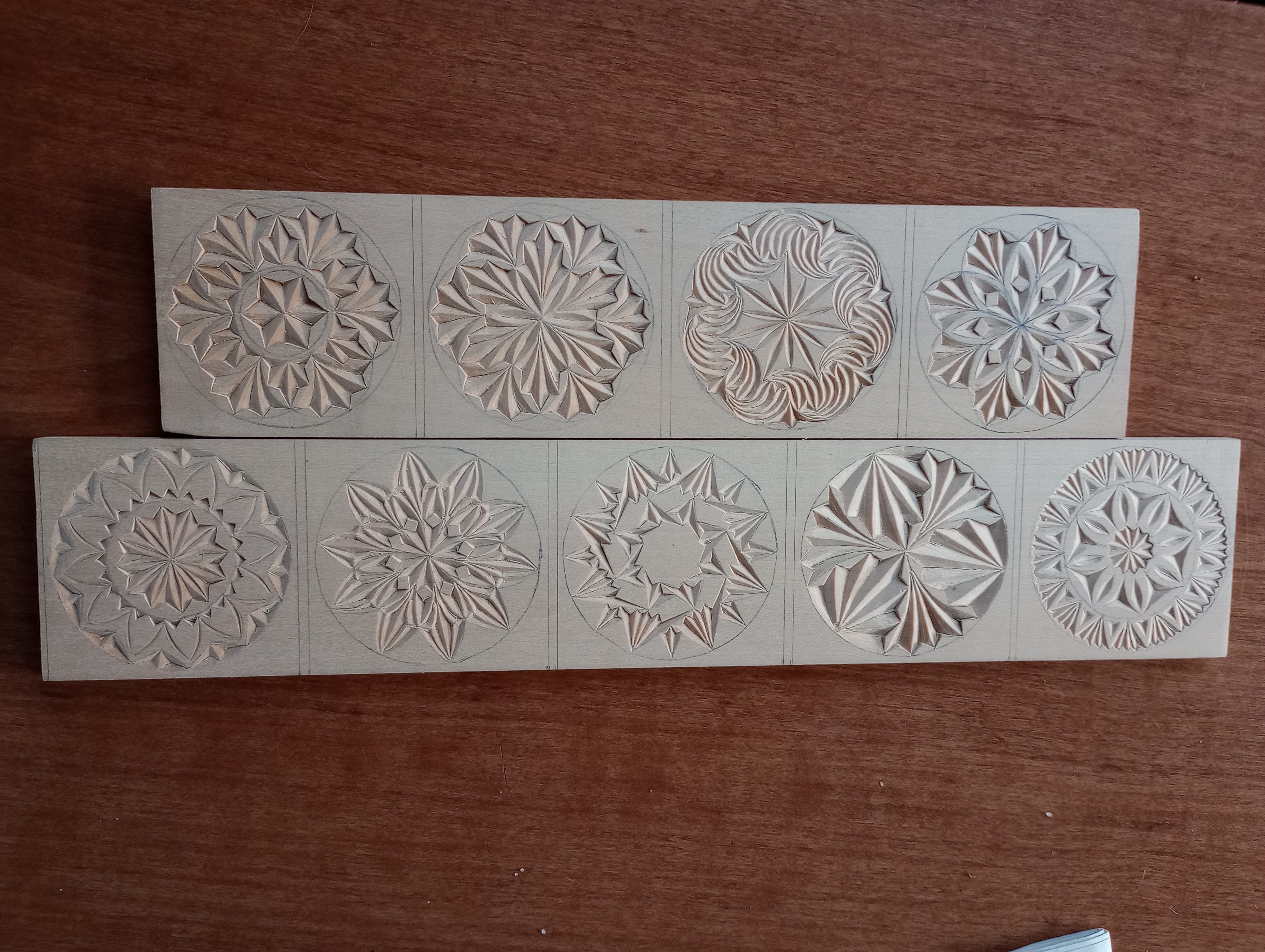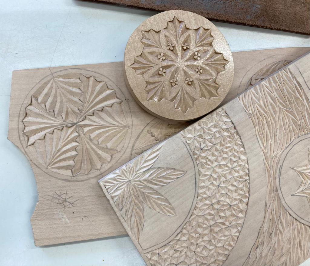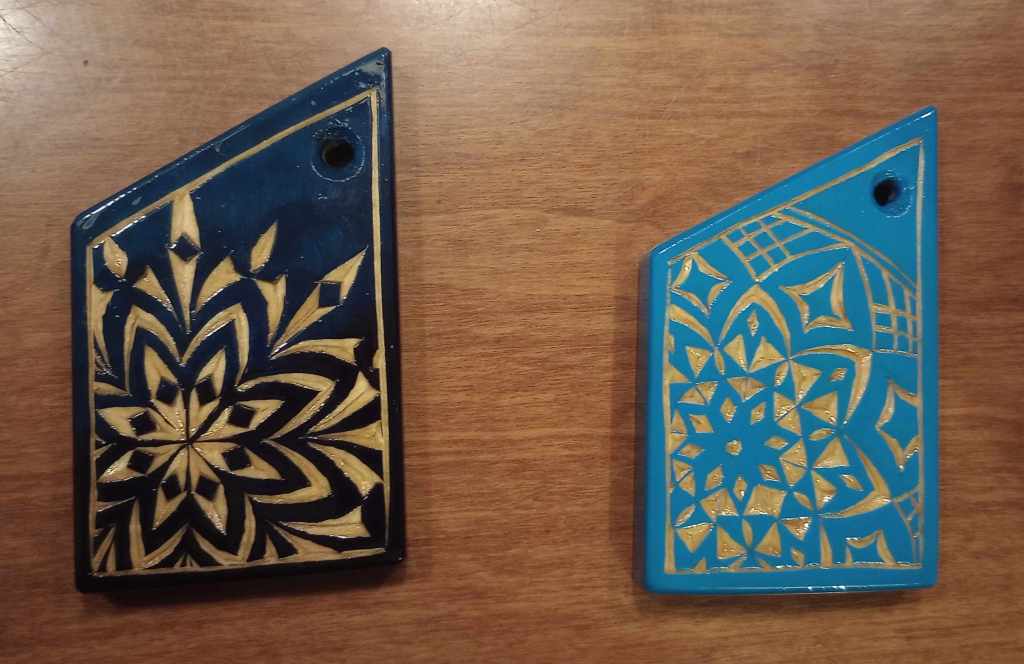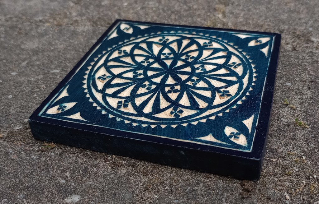 Koffietafel met patroon van vlakvullingen (I)SleutelhangersOnderzetters met rozetten, nog uit te zagenWerkstukken klaar om af te werken